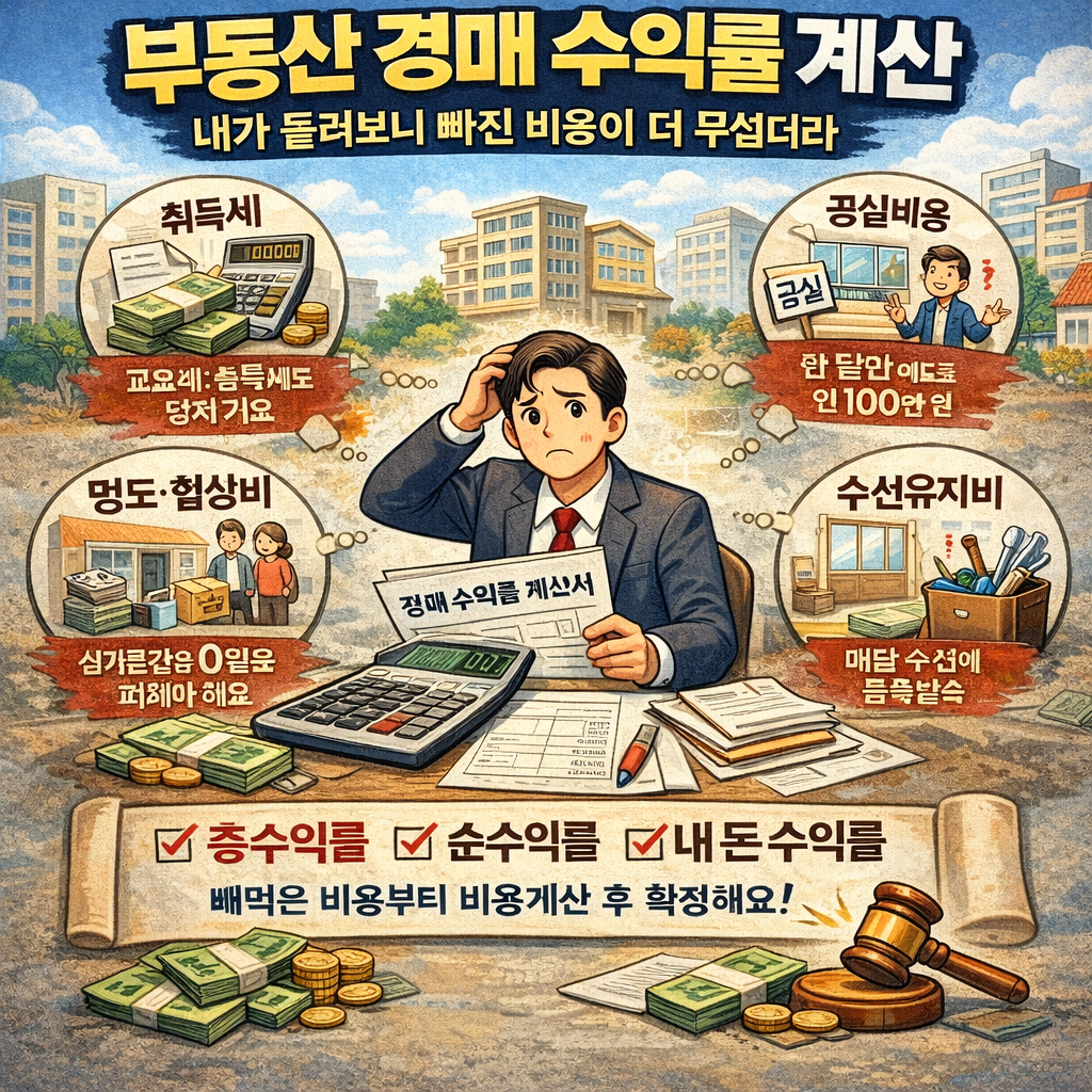 경매 물건을 보면 낙찰가부터 계산기 두드리게 되죠. 근데 솔직히 낙찰가는 시작점일 뿐이에요. 취득세, 명도비, 공실, 수리비가 한 번만 튀면 수익률이 통째로 꺾여요. 내가 현장에서 느낀 체감은 이거였어요, 수익률은 ‘계산 실력’보다 ‘빠짐없이 적는 습관’에서 갈리더라고요.