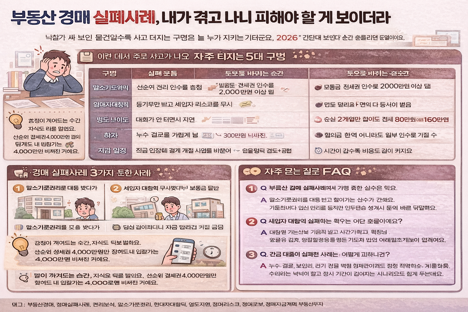 A. 실패사례는 겁주려는 게 아니라 체크 포인트를 알려주는 자료예요. 말소기준권리, 점유, 예비비 같은 핵심만 단단히 잡으면 큰 사고 확률이 줄어요.