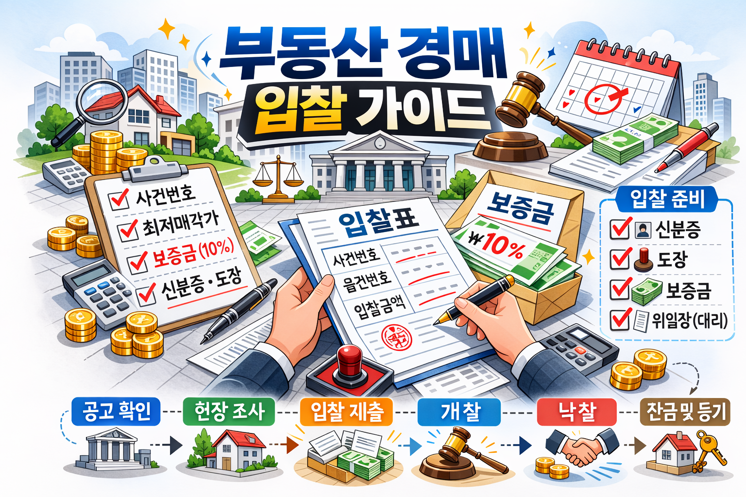 아, 당일 동선은 생각보다 단순해요. 기일입찰이면 매각기일에 출석해서 입찰표를 작성하고 매수신청보증과 함께 집행관에게 제출하는 흐름이 생활법령정보에 정리돼 있어요. 기간입찰은 입찰기간 안에 작성한 입찰표와 매수신청보증을 제출하고, 개찰은 매각기일에 출석한 가운데 진행될 수 있다고 설명돼요. 그러니까 “어디서, 언제, 어떤 봉투를 내는지”만 머릿속에 고정하면 돼요. 정말 이게 다예요!