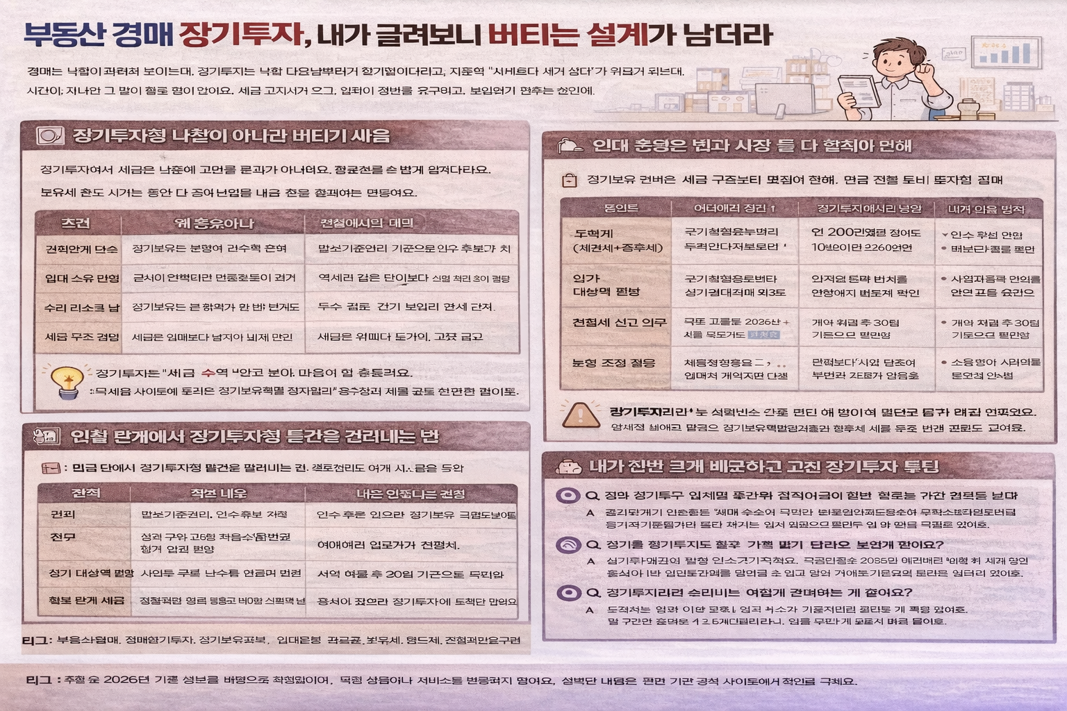 장기투자 전략은 화끈한 한 방이 아니라, 작은 누수를 막는 습관에 가까워요. 보유세와 양도세처럼 제도에 묶이는 구간이 있고, 임대차처럼 사람과 법이 같이 움직이는 구간이 있어요. 국세청 안내에는 장기보유특별공제율과 종합부동산세 세율 같은 기본 구조가 공개돼 있고, 국토교통부 안내에는 전월세 신고제 계도기간 종료 같은 변경점도 올라와요. 오늘은 이 변화들을 장기투자 관점에서 묶어서, 경매로 매입했을 때 어떤 루틴이 오래 버티게 하는지 풀어볼게요.