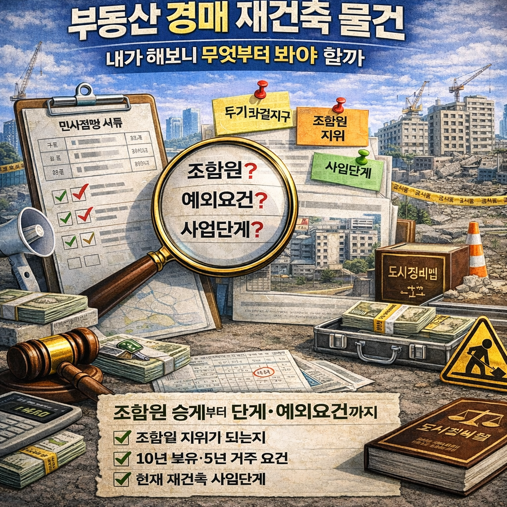 경매 목록에서 재건축 단지를 보면 가격이 미묘하게 낮게 잡힌 물건이 자주 보여요. 감정가 대비 내려온 숫자만 보면 욕심이 스멀스멀 올라오는데, 이상하게 손이 쉽게 안 나가더라고요. 재건축은 집 한 채를 사는 게 아니라 권리와 일정까지 같이 사는 느낌이 강하거든요. 숫자 하나가 아니라 규정 한 줄이 결과를 바꿔서 더 긴장돼요.