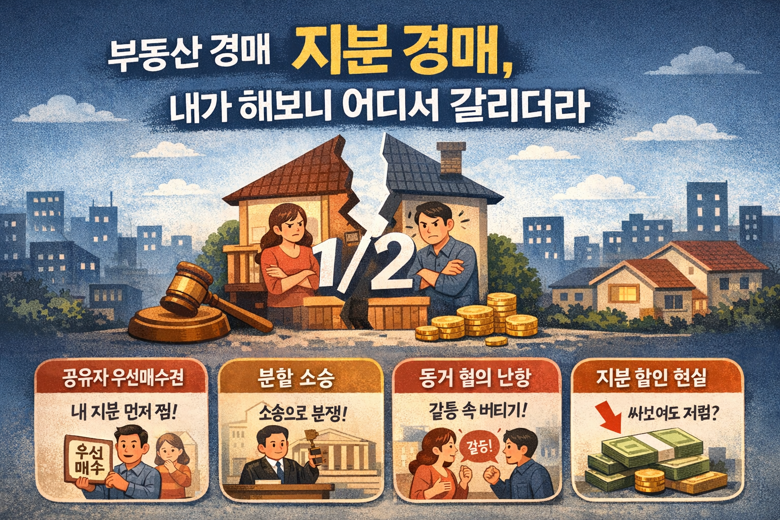 지분 경매는 부동산의 일부 지분만 매각되는 경우를 말해요. 예를 들어 2분의 1, 3분의 1 같은 지분이 경매로 나오죠. 여기서 핵심은 내가 낙찰받아도 단독 소유가 아니라 공유자가 된다는 점이에요. 단독 소유면 문 열고 들어가서 쓰는 그림이 나오는데, 공유면 문을 열기 전에 ‘다른 소유자’가 항상 같이 떠올라요. 이 차이가 가격을 때려 눕혀요.