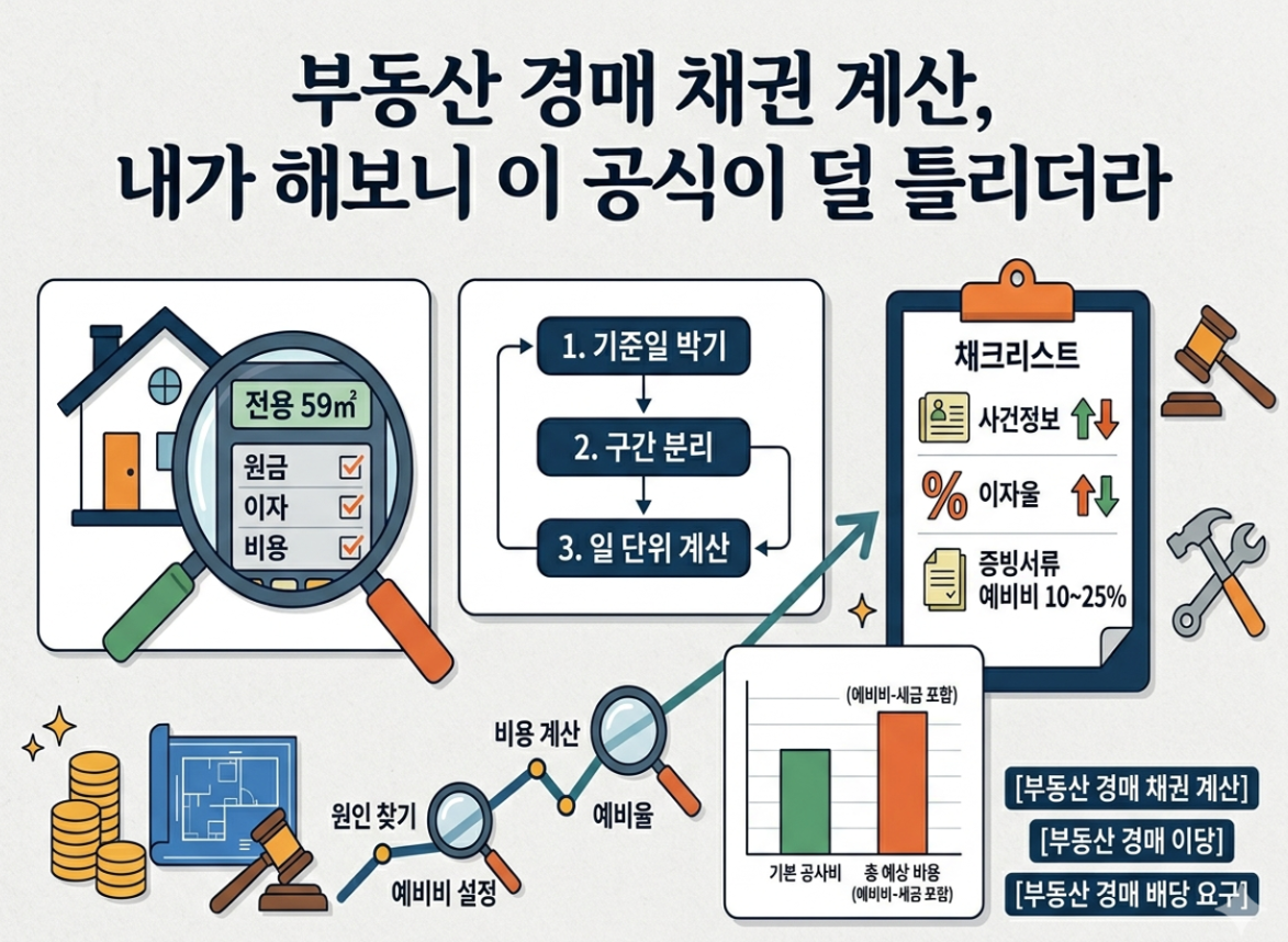 법원경매정보 경매절차 안내에는 채권자가 배당요구 종기까지 원금, 이자, 비용 등 부대채권의 계산서를 제출해야 한다고 적혀 있어요. 민사집행규칙에도 배당기일이 정해지면 법원사무관 등이 채권자에게 원금과 배당기일까지의 이자 등을 적은 계산서를 내도록 최고하는 조문이 있어요. 결국 경매 채권 계산은 “대충”이 아니라 “날짜 기준으로 다시 쓰는 작업”인 셈이에요.