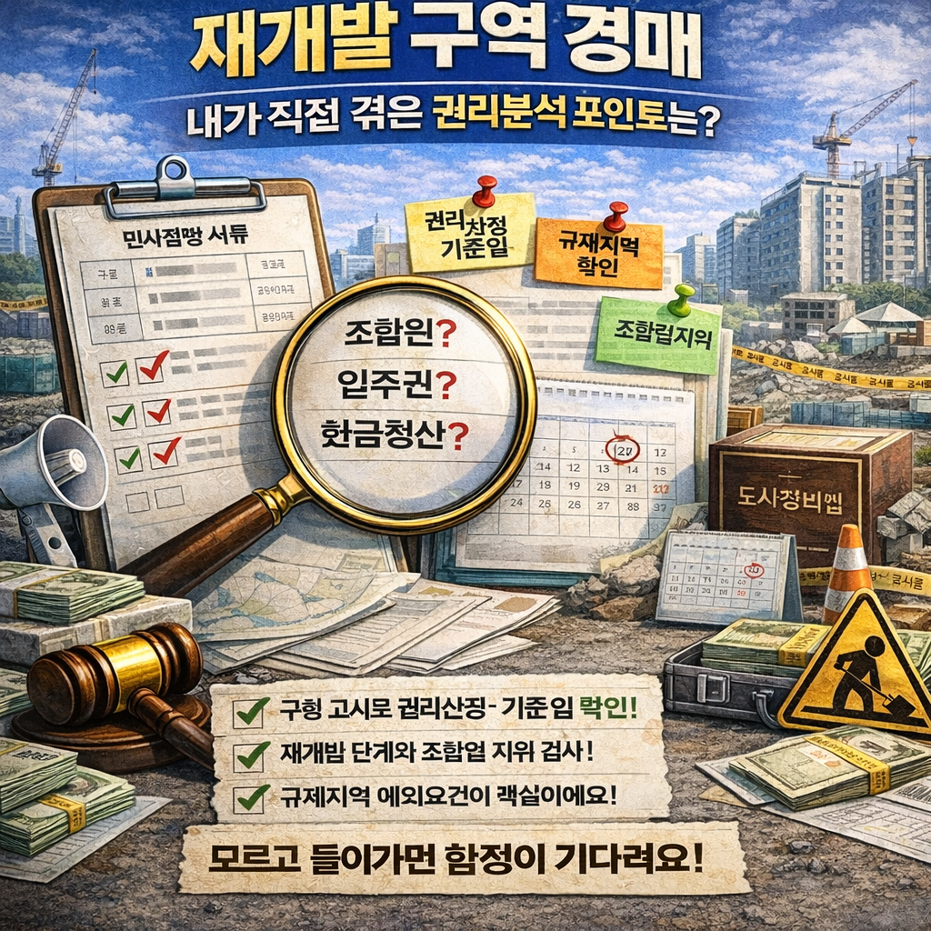 경매 알림에서 “재개발 구역” 표시가 붙은 물건을 보면, 싸게 나와도 손이 쉽게 안 가더라고요. 서류 몇 장으로 끝나는 게임이 아니라, 정비사업 일정표까지 같이 읽어야 하는 판이니까요. 근데 이 복잡함이 곧 할인으로 연결되는 경우도 많아서, 괜히 눈을 피하게 되진 않았어요. 실제로 재개발은 입주권 기대가 커서 경쟁이 붙기도 하고, 반대로 규정 한 줄 때문에 현금청산으로 꺾이기도 하거든요.