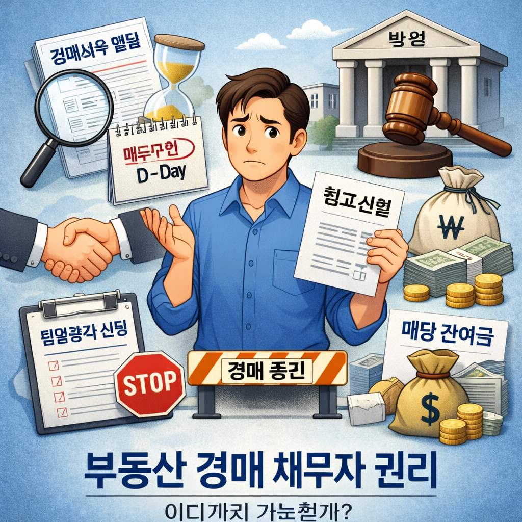 경매를 보면 채권자 이야기는 넘치는데, 채무자 권리는 유난히 조용하게 다뤄져요. 그래서 “채무자는 할 수 있는 게 없다”는 말이 쉽게 퍼지죠. 근데 실제로는 할 수 있는 게 없어서가 아니라, 할 수 있는 타이밍이 너무 짧고 조건이 까다로워서 체감이 낮은 경우가 많더라고요. 이걸 모르고 있으면, 당사자 입장에서는 불안만 커져요.